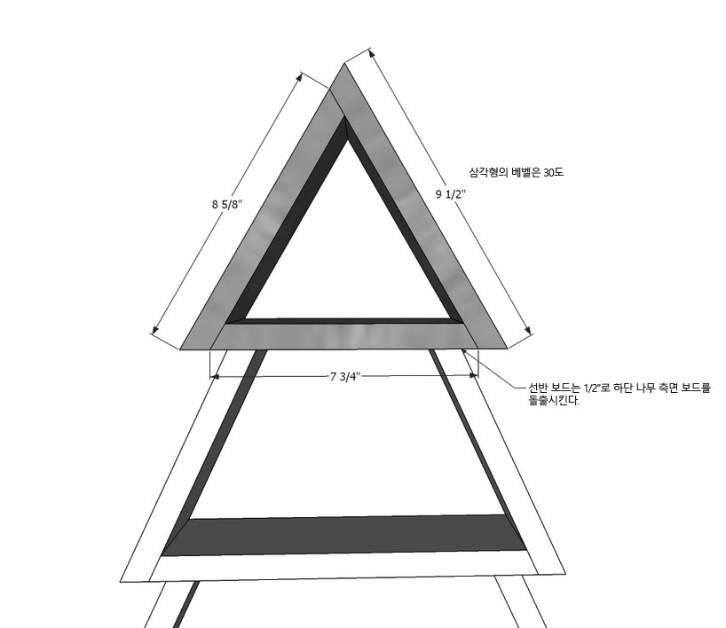 트리선반의 높이가 32"(인치)이다. 이를 센티미터로 환산하면 81.28cm이다. 우리는 미터법을 사용하기에 높이는 80~90cm로 결정하면 된다. 또 맨밑단의 폭은 20과 3/8"(인치)이다. 이를 cm로 환산하면 51.75cm이다. 우리는 하단폭을 52cm로 결정하면 된다. 하지만, 이거고 저거고 다 떠나 크기는 만드는 사람의 마음대로 결정하면 된다.