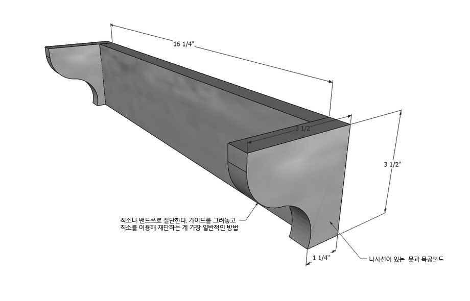1단계![]() 측면 재단이 어려울 수 있다. 그러나 방법을 알면 매우 간단하다. 연필로 자재에 곡선을 그린 후 직쏘를 이용해 재단하면 쉽게 만들 수 있다. 측면은 지지대의 역할도 병행하기에 네 개를 만들어 두개씩 목공본드와 나사못을 이용해 붙여 만든다. |