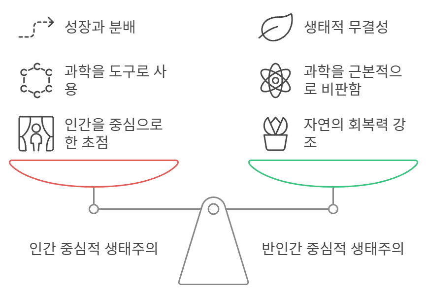 생태주의 안에도 두 가지 흐름이 있습니다. 인간중심주의 생태주의와 반인간중심주의 생태주의죠. 두 흐름 사이에는 논쟁이 존재하고 있습니다.