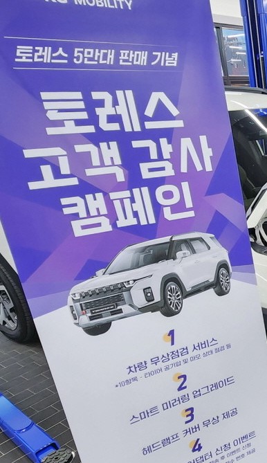 한편 KG모빌리티는 토레스 5만대 판매를 기념해 기존 토레스 고객과 약속했던 스마트 미러링 소프트웨어 업데이트, 헤드램프 눈쌓임 방지 커버 지급, 인포콘 무상 서비스 기간 5년 연장 등 토레스 고객 감사 캠페인을 시행하겠다고 발표했다. 아이폰 사용자는 별도의 미러링 어댑터를 받을 수 있다고도 했다.