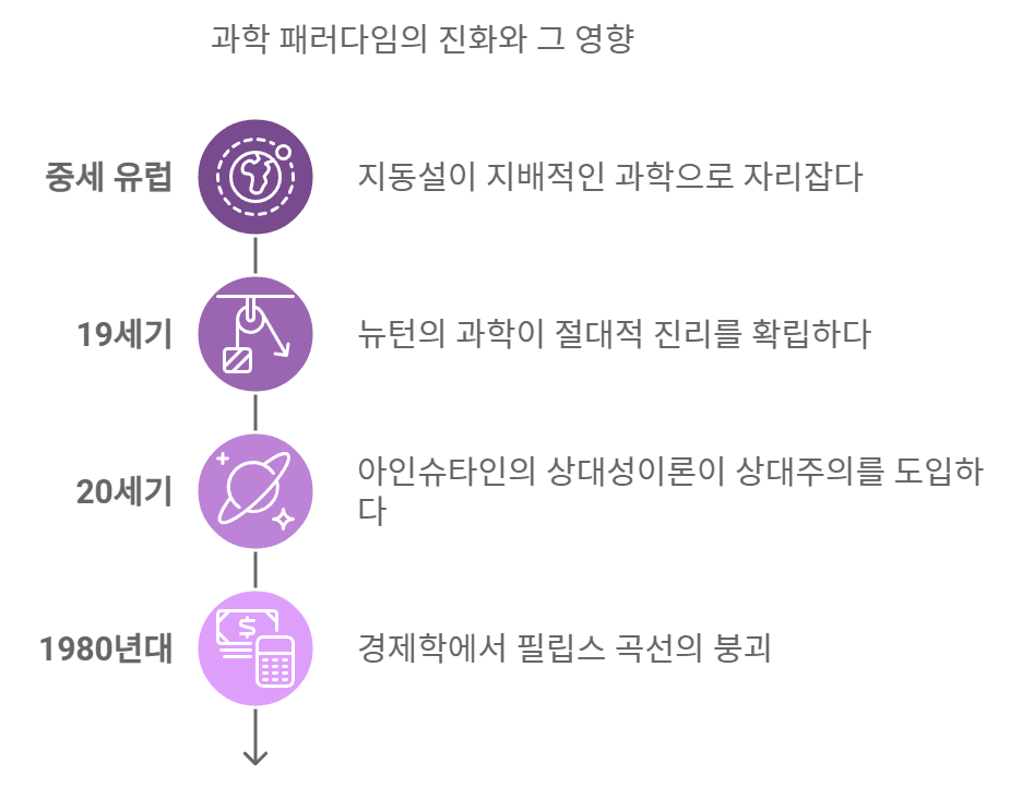 사람들의 사고방식도 변화했죠. 예를 들어 기존의 실증주의를 거부하고 해석학이 등장했고, 상대주의에 근거를 둔 행동주의 경제학이나 해석학적 사회학이 나왔습니다. 절대적 법칙이라 여겼던 경제학의 필립스 곡선, 즉 물가와 실업의 반비례 법칙도 1980년대에 들어 붕괴되고 맙니다. 상대주의적 경제학이 등장할 수밖에 없었죠.