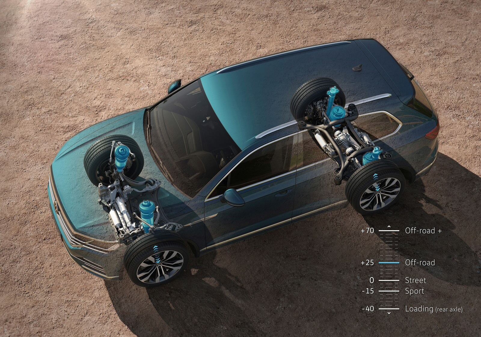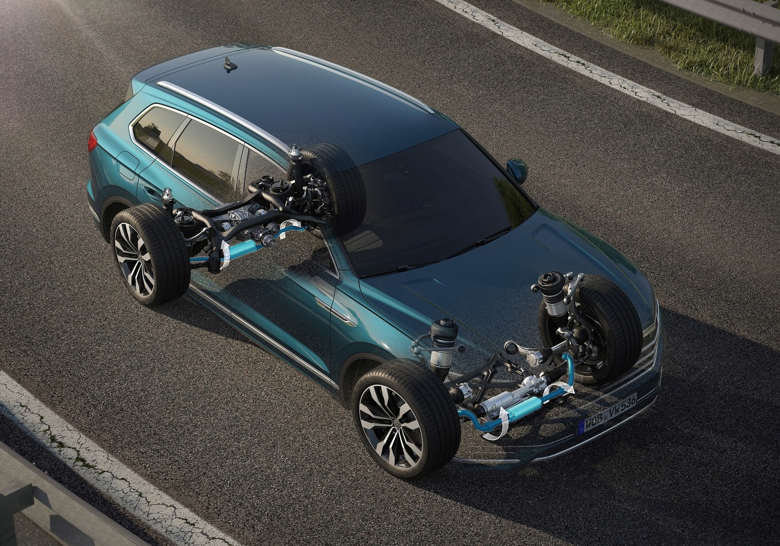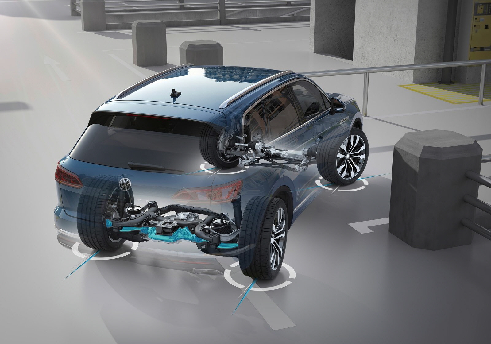 손잡이를 움직이며, 전기 기계식으로 제어되는 안티롤 바를 사용한 새로운 롤 안정화 및 'IQ'.조명 - LED 매트릭스 헤드라이트(인터랙티브, 카메라 기반 하향 및 메인 빔 헤드램프 컨트롤 및 윈드실드 헤드업 디스플레이(Windshield Head-up Display)가 윈드스크린에 직접 투사되는데 이 시스템은 폴크스바겐 투아레그에서 단일 유닛으로는 처음이다. 새로운 중앙 제어 장치를 통해 상호 연결되며, 백그라운드에서 눈에 보이지 않게 작동하며 이전보다 더 안전하고 편리하며 직관적인 드라이빙을 할 수 있다.