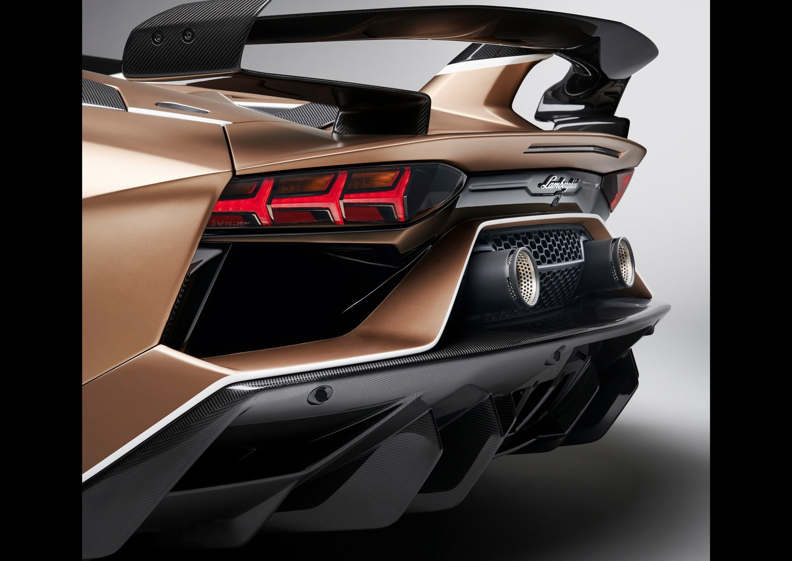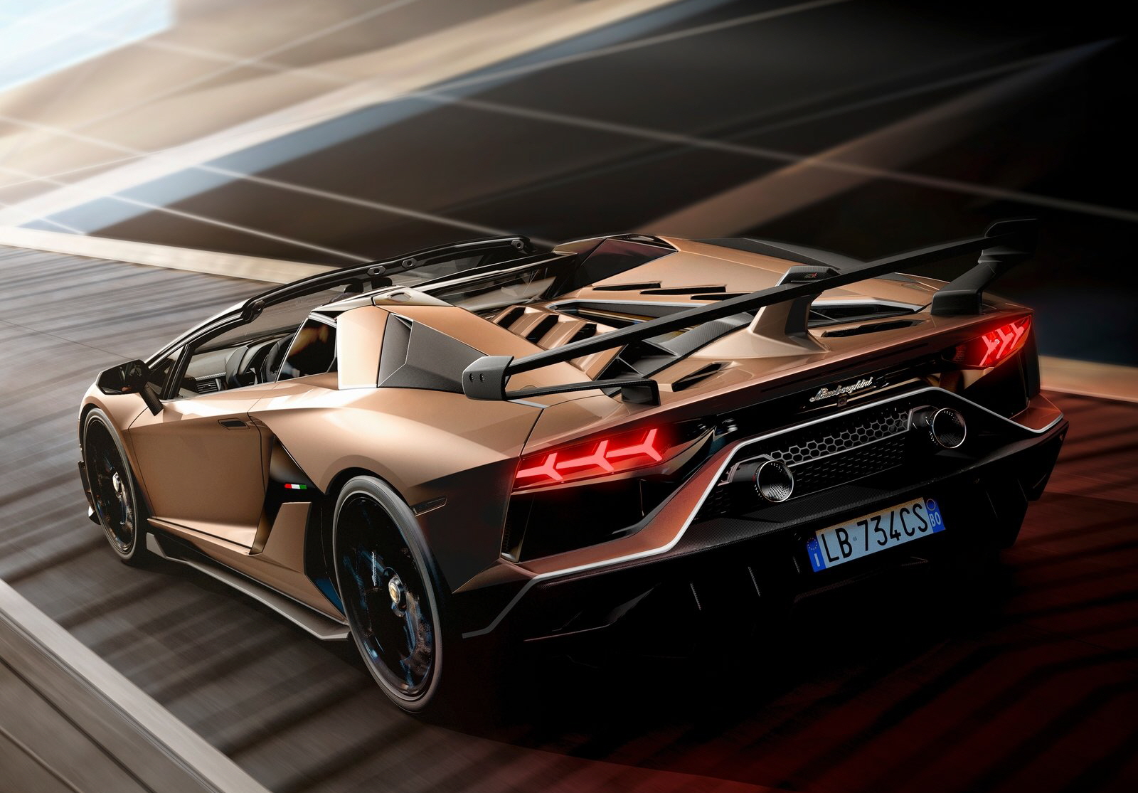 2020 람보르기니 아벤타도르 SVJ 로드스터는 티타늄 흡기 밸브, 새로운 형태의 흡기 러너, 더 높은 유량 계수를 위한 수정된 흡기 실린더 헤드 덕트가 있는 V12 SVJ 강화 내용은 퀵 릴리즈 클립을 통해 탈착 가능한 경량 탄소 섬유 리어 엔진 보닛을 통해 볼 수 있다. 하이 마운티드 경량 배기는 SVJ 로드스터의 엔진에서 가장 감성적인 소리를 발생시켜 로드스터 탑승자에게 짜릿함을 더하게 한다.