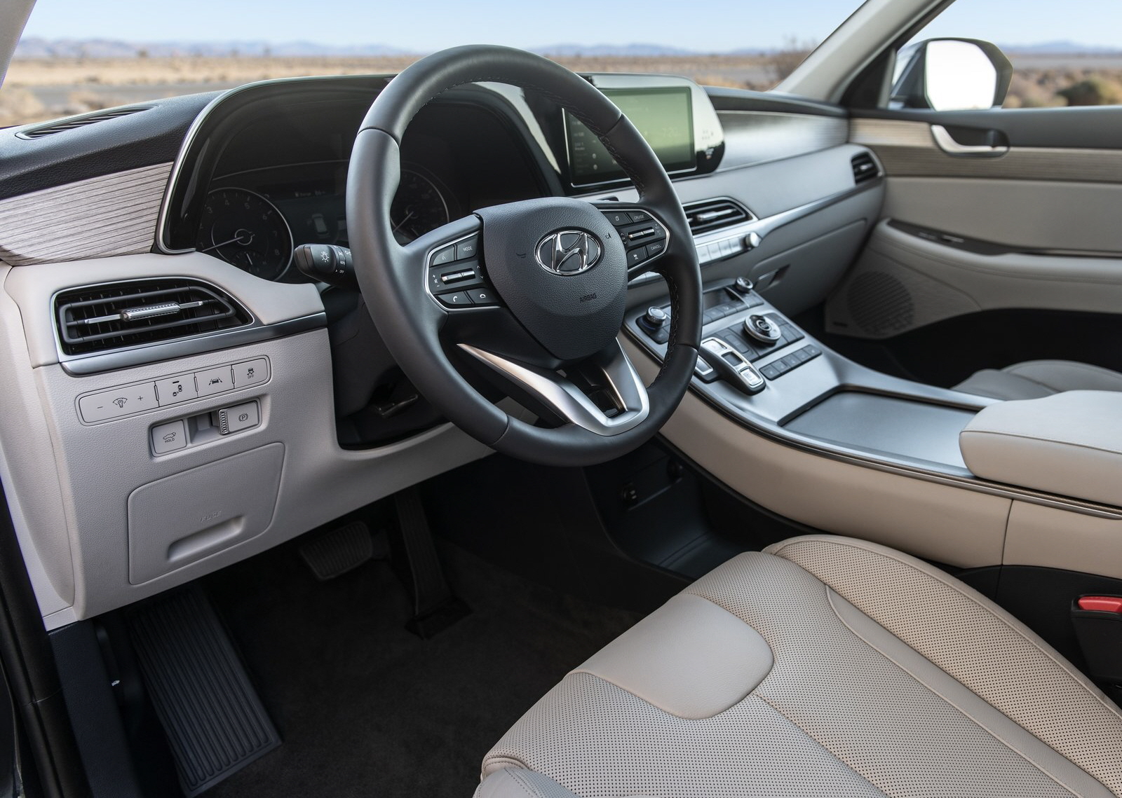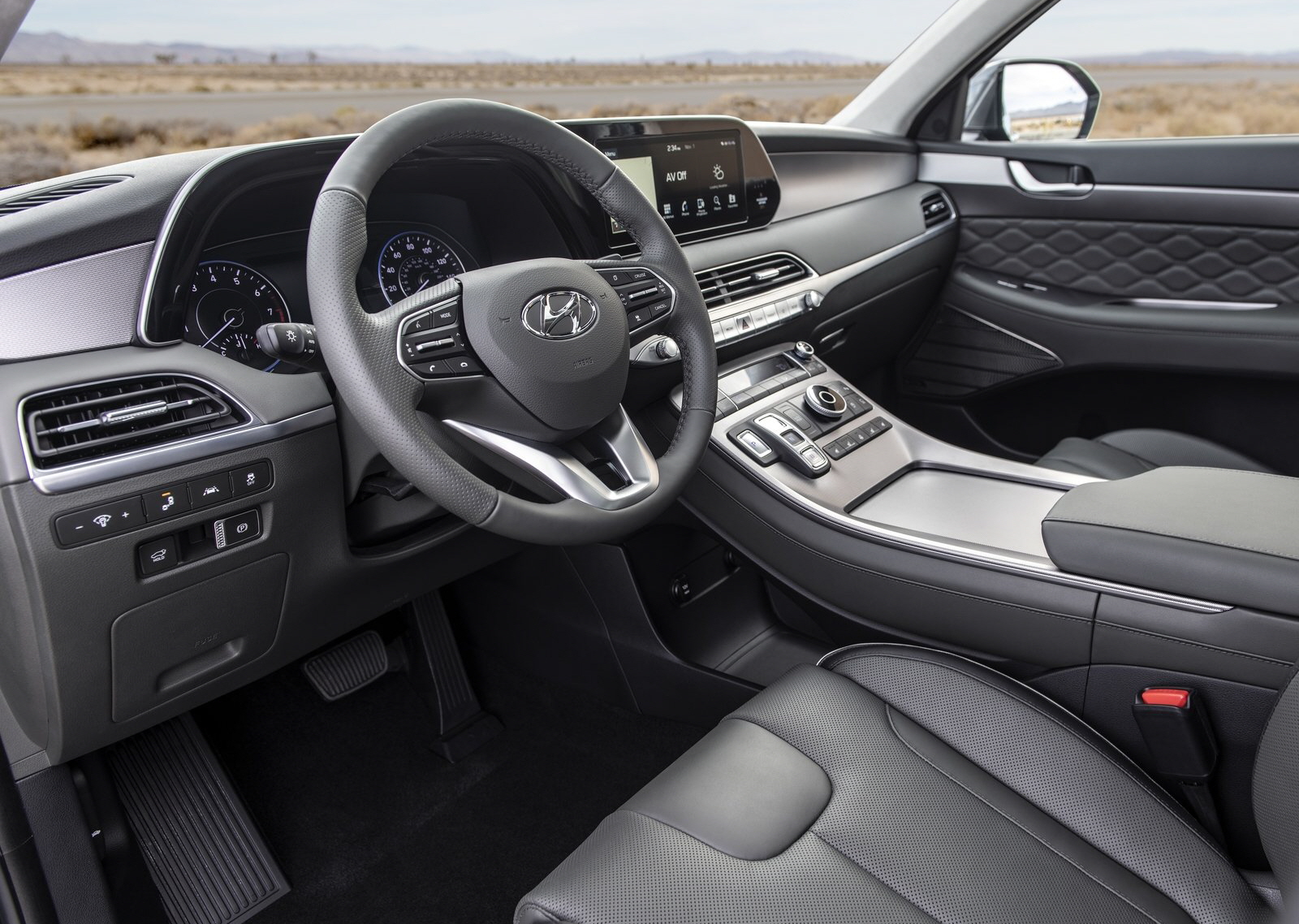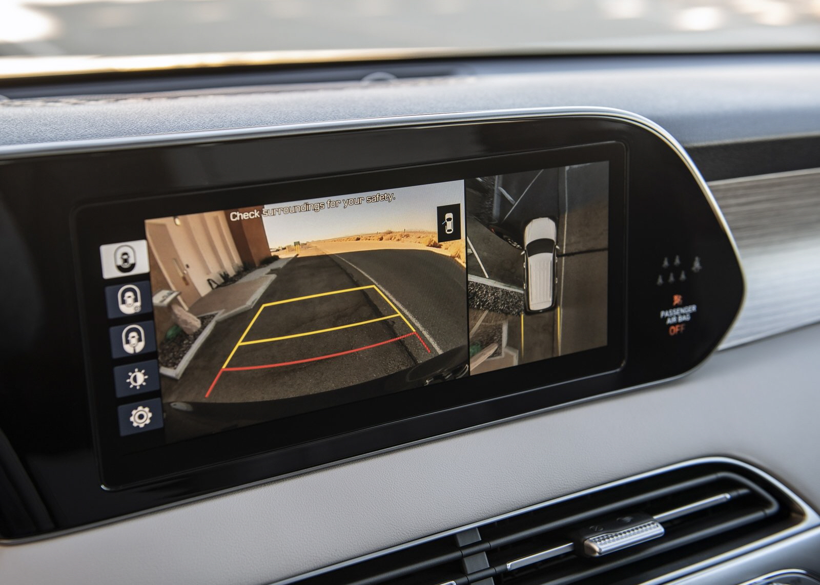 팰리세이드도 표준 사각지대 충돌 회피 어시스트 기능을 보완한 클래스 전용 블라인드 뷰 모니터를 선보여 방향 지시등이 작동될 때마다 쉽게 볼 수 있는 차체 측 오디오 및 내비게이션 디스플레이는 와이드스크린 형식의 넉넉한 10.25인치 터치스크린으로, 다양한 뷰 모드와 차별화된 주행 모드 조명을 제공하는 12.3인치 완전 디지털 TFT 중앙 계기판과 결합되어 있다.