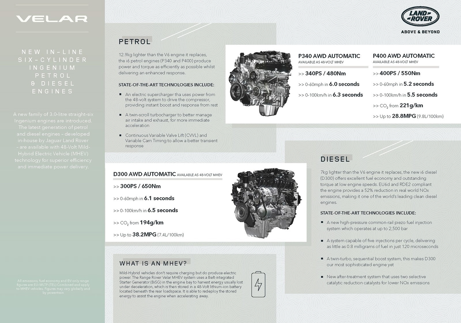 레인지로버 벨라 2021 P400에는 신형 인제니움 3.0리터 인라인 6 가솔린 엔진이 실렸다. 400마력, 토크 56.1㎏·m의 고성능으로 제로백 5.5초의 SUV로서는 아주 준수한 가속성능을 지녔다. 최고속도는 250㎞/h로 제어되었다. 마일드 하이브리드 테크놀로지, 트윈 터보차저, 마찰을 확기적으로 줄이는 설계 등이 적용돼 한껏 업그레이 된 탁월한 성능과 효율성이 보장된다.
