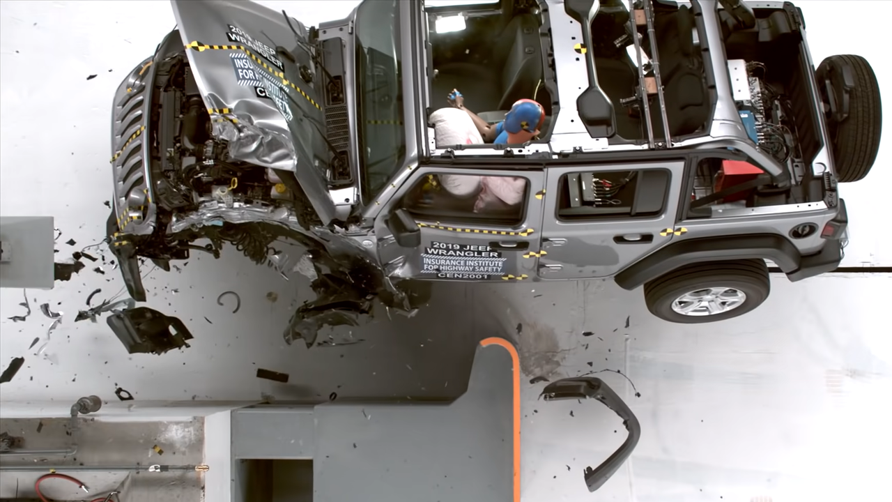 2018년 재설계된 지프랭글러 SUV는 피아트 크라이슬러가 연구소 검증시험 프로그램의 일환으로 차량연구센터에서 각각 3차례의 운전자 측 스몰 오버랩 충돌시험을 받았다. IIHS에 의해 수행된 두 번의 테스트에서 랭글러는 장애물에 충돌 한 후의 충격으로 조수석 방향으로 전복되고 말았다.