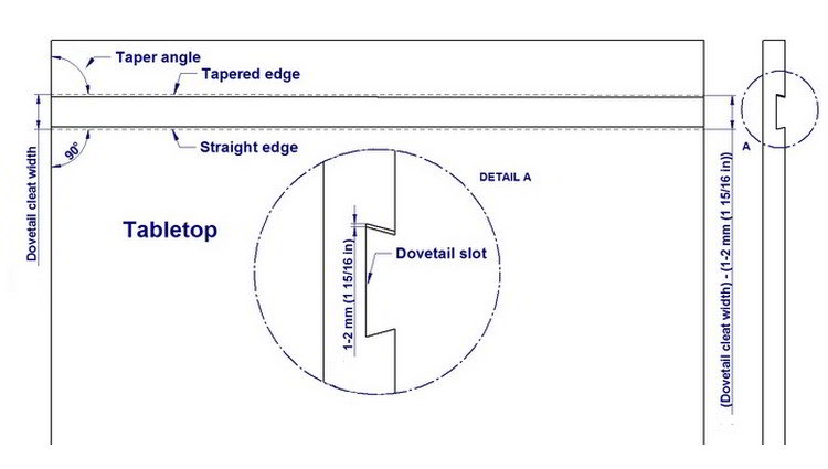 9. 도브테일 클리트 – 슬롯 및 도브테일 클리트 테이퍼 1/16 인치. 한쪽 끝에서 다른 쪽 끝까지의 너비. 더브 테일 클릿은 탁상을 평평하게 유지하고 상판유격에 가장 잘 대응한다. 초, 중급단계에선 설명이나 이미지만으로는 잘 이해하지 못할 수 있다. 테이블쏘, 드릴 등 장비사용이 능숙하면 제작이 쉽다.