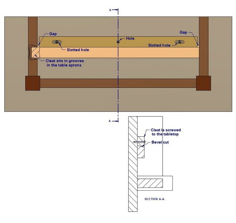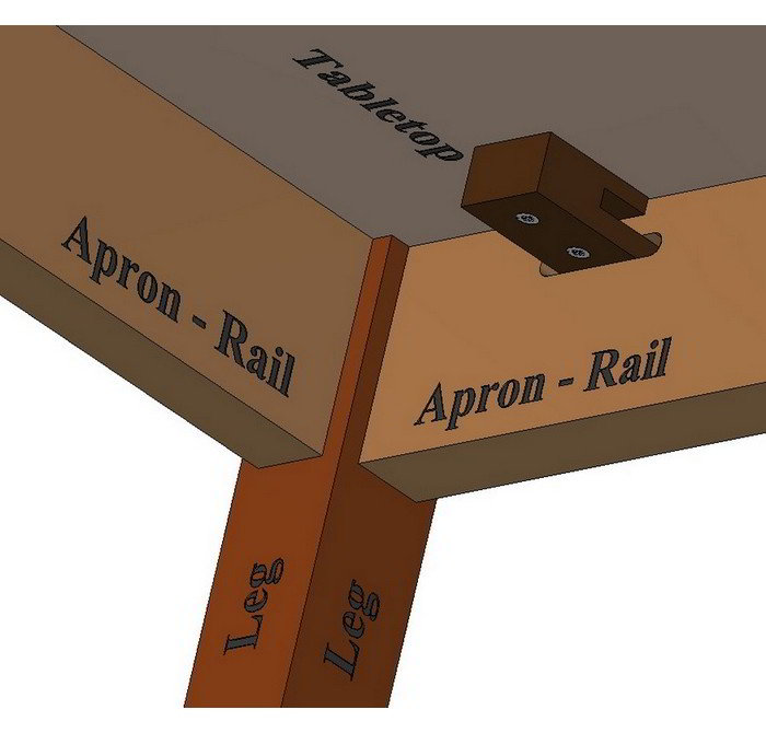5. 홈이있는 클릿 (우드 블록) – 에이프런 레일에 붙이고 테이블 상판 아래에 나사로 고정한다. 블록은 긴 결 (끝 결이 아님)이 전면 에이프런 레일에 고정해야 한다. 아주 간단하게 제작하여 사용할 수 있다.