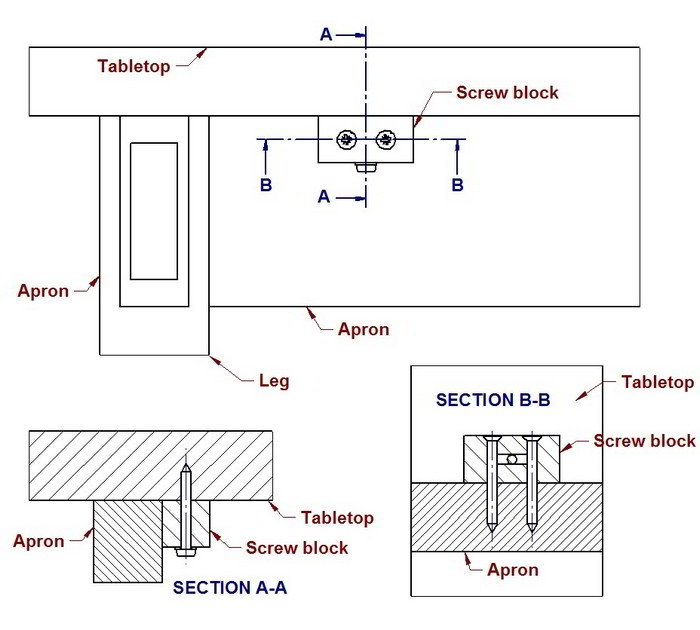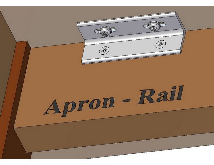 7. 더브 테일 블록 – 상판 변형이 일어났을 때 가장 안정적인 고정방법이지만 초급 시절에는 만들기가 까다롭다. 도브테일 모양의 부분이 상판에 나사로 고정되고 해당 슬롯이 있는 블록이 에이프런 레일에 고정된다.