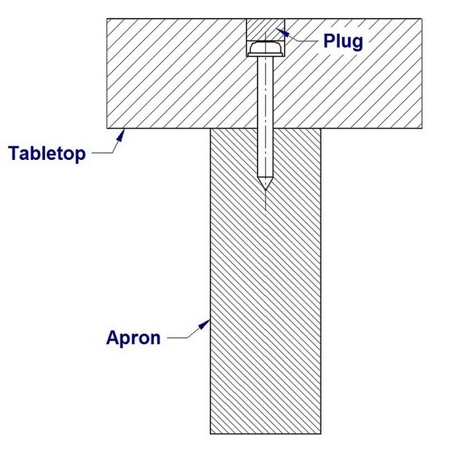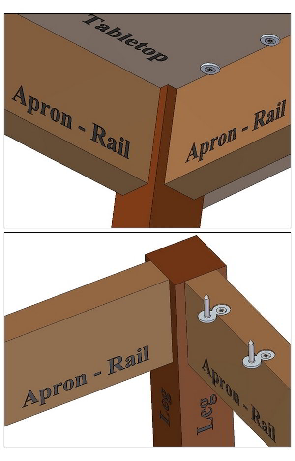 상판을 관통해 목다보로 고정하는 방법과 상판과 에이프런 레일을 드릴로 도웰링하여 부착하는 방법이 있다. 후자를 택하면 상판에 흠이 없어 매우 깔끔하지만, 이 방식은 중급 이상만 권장한다.