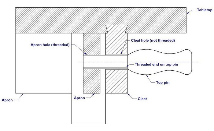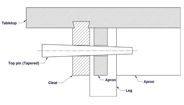 15. 두 가지 상단 핀 – 상단 핀은 테이퍼 스타일과 나사산 스타일을 쓴다. 이 방법은 확장 할 때 자주 이동해야하는 무겁고 큰 테이블에 적합하다. 펍이나 정육점의 테이블 등에 주로 쓰였다. 테이블만 분리하여 이동해야 하는 무거운 상판에 쓰인다.